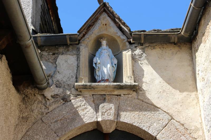 Au sommet de la colline, sur un amas de chaos granitique, la statue en fonte de la Vierge Marie surplombe...